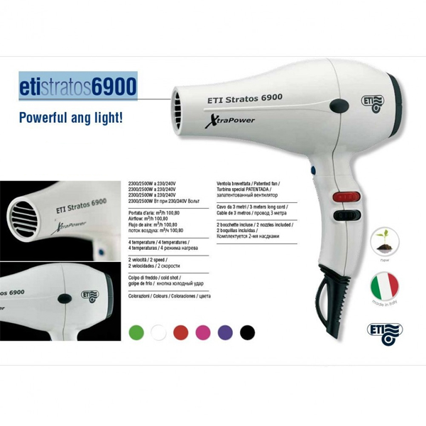 Επαγγελματικό ιταλικό σεσουάρ με μεγάλη ισχύ και 4 ρυθμίσεις θερμοκρασίας για γρηγορότερο στέγνωμα και μεγαλύτερη άνεση του πελάτη αντίστοιχα.