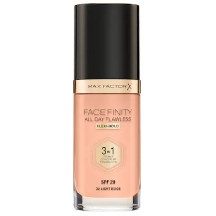 Το Facefinity All Day Flawless 3 In 1 Foundation της Max Factor είναι ένα καινοτόμο προϊόν που έχει τριπλή δράση. Λειτουργεί ως primer , foundation και concealer δίνοντας την δυνατότητα μόνο με ένα προϊόν να αποκτάμε λαμπερή επιδερμίδα, απαλλαγμένη από ατέλειες και σημάδια. Ως primer προετοιμάζει την επιδερμίδα για το μακιγιάζ. Ως concealer μπορεί να εφαρμοστεί κάτω από τα μάτια σε αντίθεση με άλλα make up καλύπτοντας έτσι ατέλειες και μαύρους κύκλους. Τέλος, ως foundation έχει ελαφριά υφή και παρόλο το ματ τελείωμα αφήνει ένα απόλυτα φυσικό αποτέλεσμα χωρίς γυαλάδα και λιπαρότητα το οποίο μένει αναλλοίωτο για ώρες. Ταιριάζει σε όλους τους τύπους δέρματος και διαθέτει δείκτη προστασίας με SPF 20 για την προστασία του δέρματος από τον ήλιο. Δερματολογικά ελεγμένο.